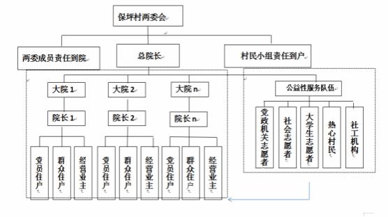 “院长制”融合多元主体参与形成了保坪村乡村治理共建共治共享的新格局。村委设立社会工作室,“院长”和社会组织实施规范管理。落实责任制,村两委成员责任到院,村民小组责任到户,各大院党员住户,在门户牌上注明党员身份,起示范带头作用。农户参与大院建设的民主决策,院落居民既是“院长制”的受益者,也是“院长制”的主导者。无论是大院居民自主创业经营,还是引进的企业业主,都会参与到大院建设中来。村委组建“萤火虫”夜间巡逻、“洁卫士”志愿者服务队,引进社工机构,对空巢老人、留守儿童、留守妇女、残疾人员开展帮扶服务,弱势群体得到有效照料。